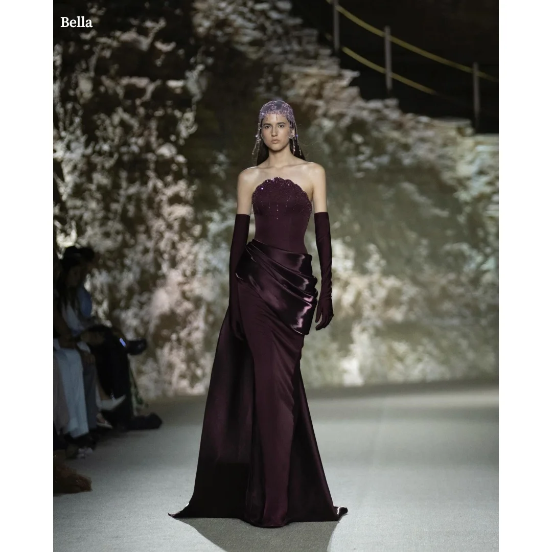 벨라 맞춤형 버건디 스트랩리스 프롬 드레스, 스팽글 보디스, 새틴 드레이핑 머메이드 플로어 기장, 롱 글러브 포함, 이브닝 드레스