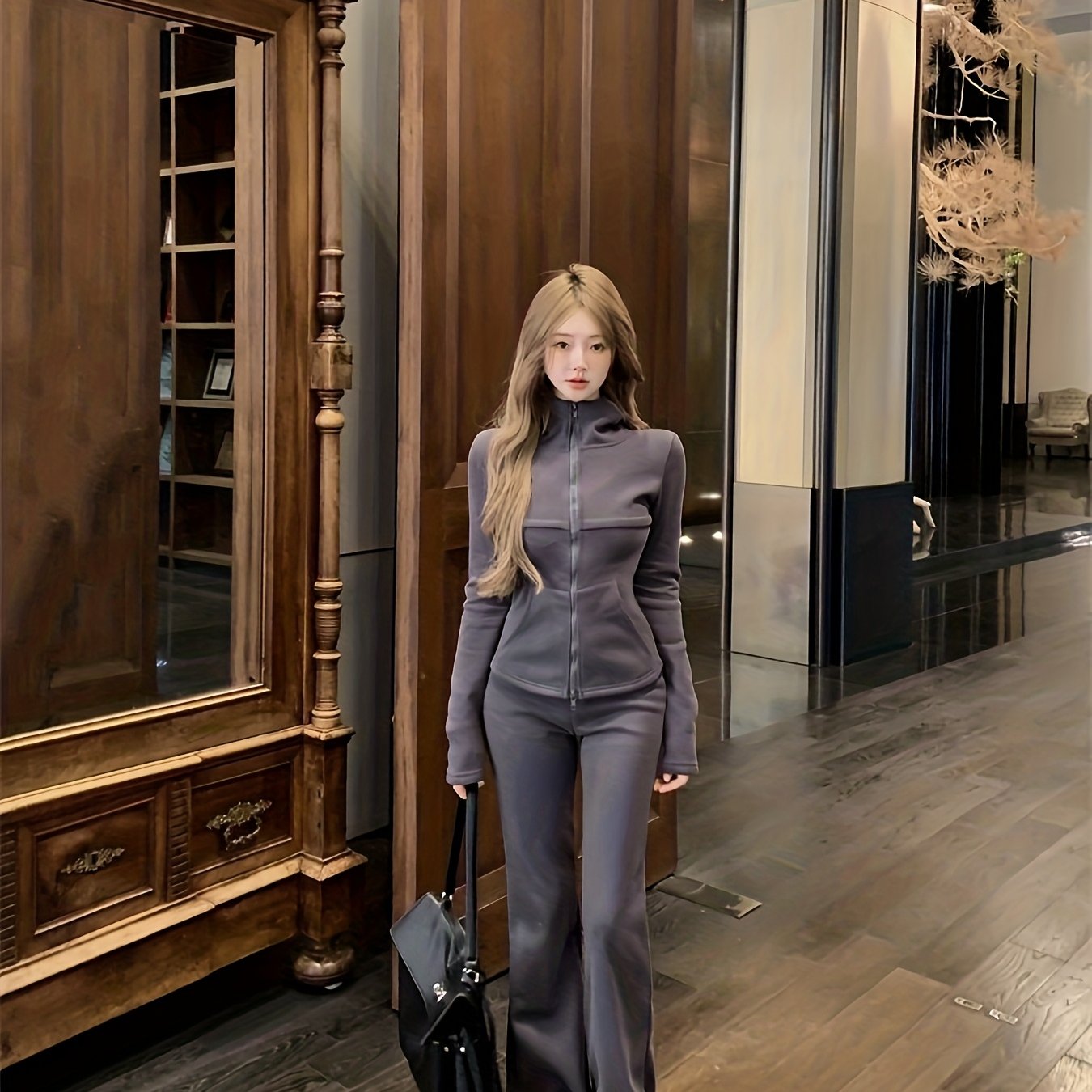 TEMU 2025 가을 코디 세트, 한국식 스타일, 부드러운 디자인, 초슈퍼룩, 두꺼운 후드 자켓, 미니 플레어 팬츠, 투피스 세트