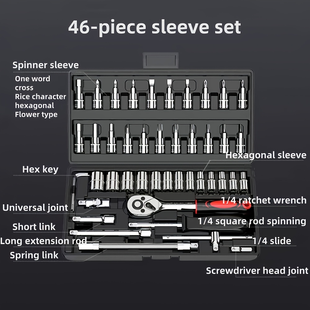 TEMU 46피스 고강도 수동 금속 소켓 & 라쳇 렌치 세트 (보관 상자 포함) - 자동차, 배관, , 자전거 수리 & 가정용 올인원 키트 - 미터법, SAE & 미터법 사이즈 포함, 내구성 있는 건설 도구