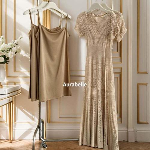 [모노무드]모노무드 아우라벨르 2세트 글램펀칭니트 시스루 반팔롱원피스