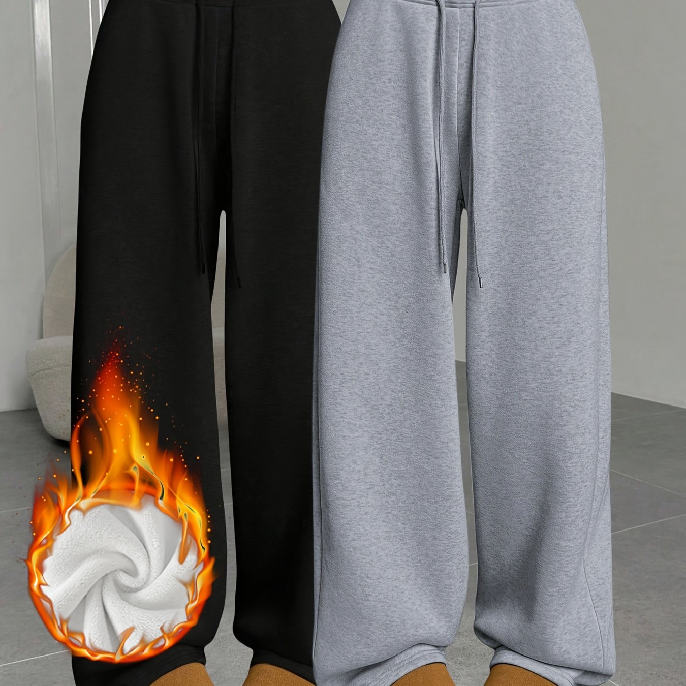 TEMU 여성용 포근한 기모 안감 와이드 레그 팬츠 세트 - 블랙 & 그레이, 캐주얼 루즈핏 드로스트링 허리, 가을/겨울에 완벽, 편안하고 스타일리시, 캐주얼 웨어|캐주얼 스타일|기모 안감 팬츠