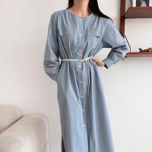 [옷자락] [시즌오프]린넨 노카라 오피스룩 벨티드 단추 롱 원피스_5