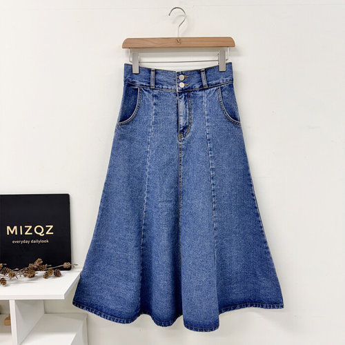 미즈큐즈 / S-L까지 투버튼 하이웨스트 절개라인 A라인 데님 롱
