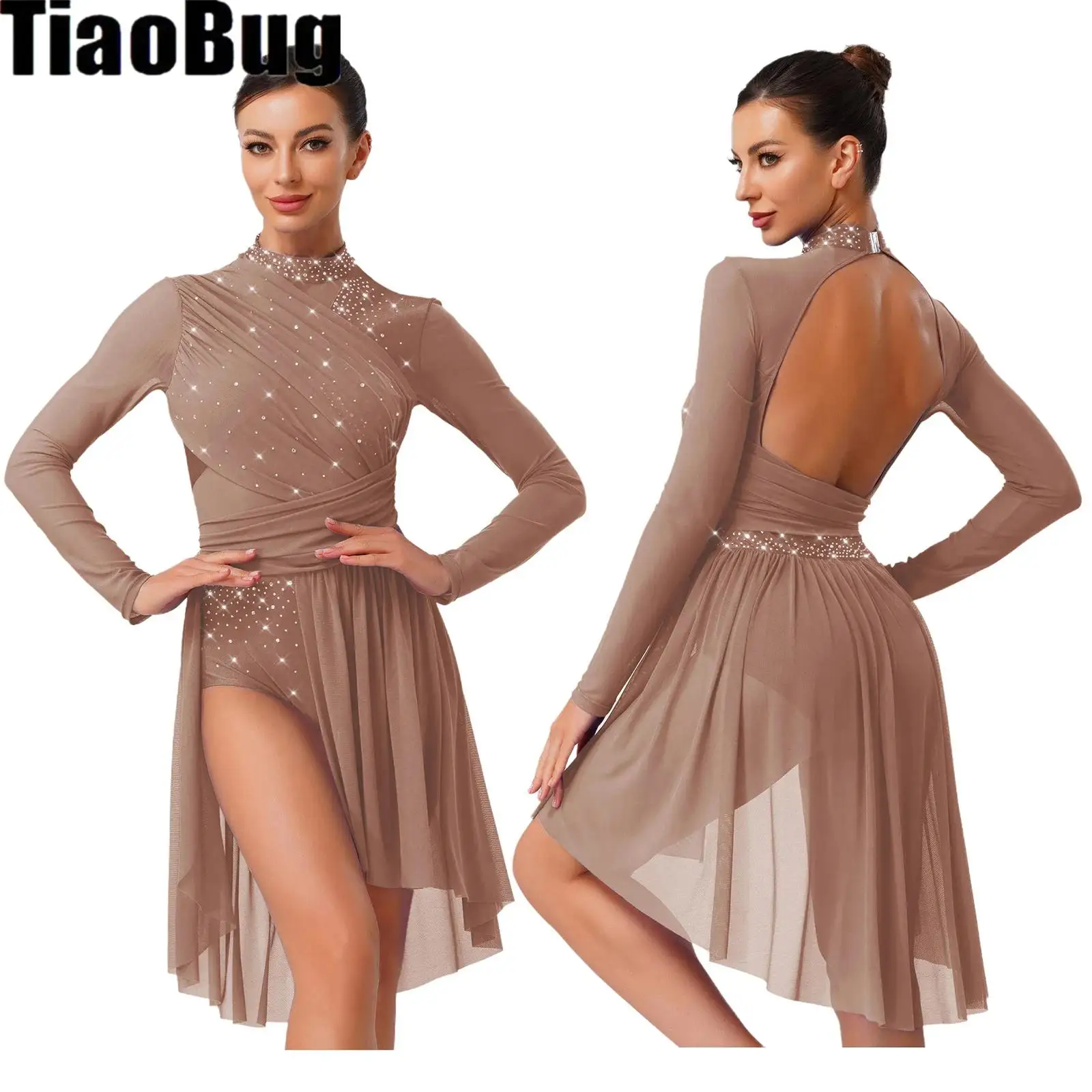 여성 서정적 댄스 드레스 라인 석 긴 소매 Ruche Backless 원피스 레오타드 드레스 현대 발레 현대 무용 의상