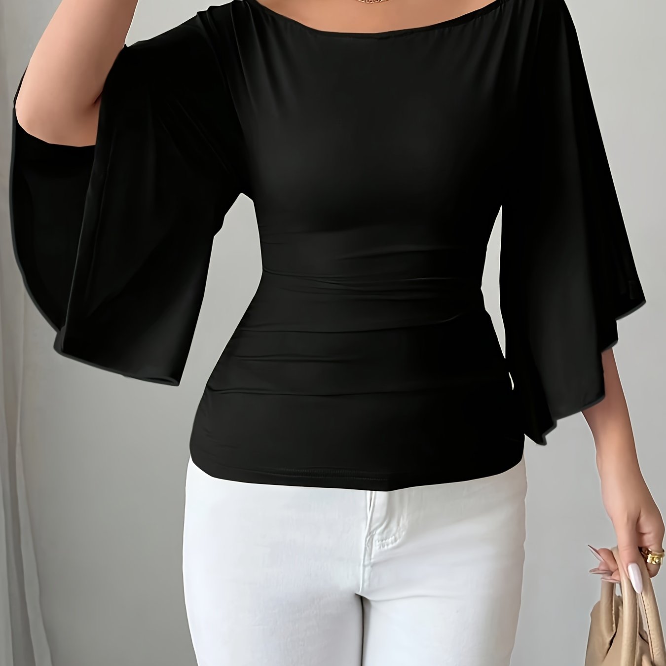 TEMU 유럽&미국 여성용 솔리드 컬러 우아한 고탄력 플레어 소매 오프숄더 티셔츠