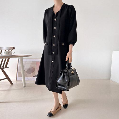 러블리감성 / 가을패션 금장 타이 롱 원피스
