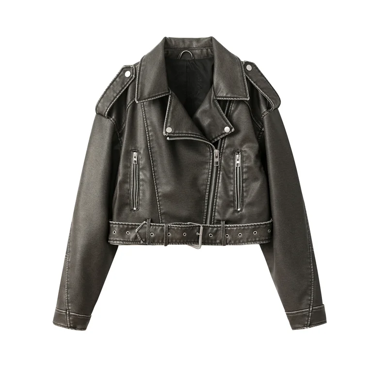 2025년 신상 석탄 회색 스타일 여성용 워싱 가죽 재킷 (벨트 포함), 다운그레이드 지퍼와 빈티지 라펠이 있는 숏 코트