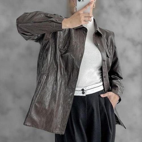 [옷자락]여성 가을 자켓 롱 벨트 카라 넥 힙 커버 슬릿 가죽 코트