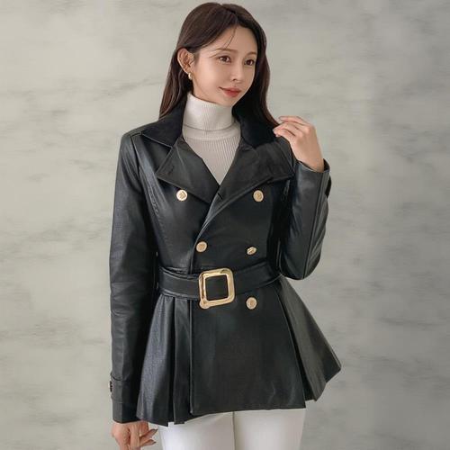 [옷자락]여성 겨울 더블버튼 금속장식 벨트 하이넥 프릴 가죽 재킷