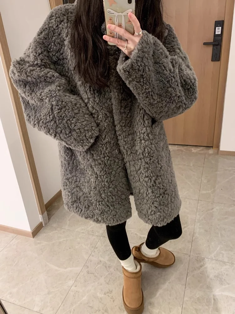 여성용 양털 자켓 2025 겨울 신상 중간 길이 오버사이즈 가죽과 모피 통합 고급스러운 느낌 코트