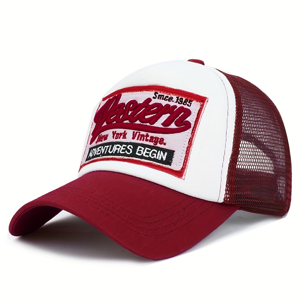 TEMU 새로운 서부 테마 트럭커 모자 - "모험은 시작된다" 자수, 경량 폴리에스터, 조절 가능한 스냅백, 검은색 & 흰색, 노란색 & 빨간색 세부 사항, 야외, 스포츠 및 캐주얼 착용에 이상적, 야외 스포츠 모자 | 서부 스타일 모자 | 경량 헤어, 서부