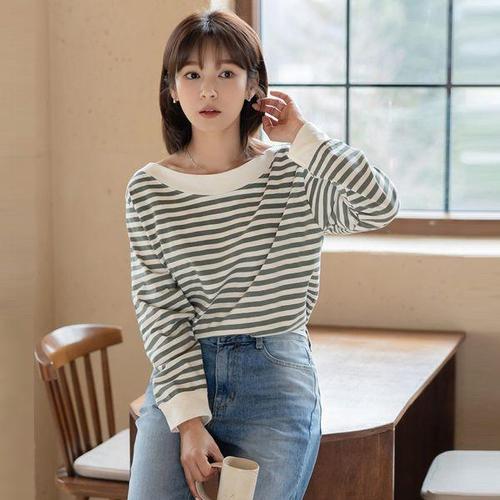 [엘리시아]폴른 보트넥 배색 단가라 티