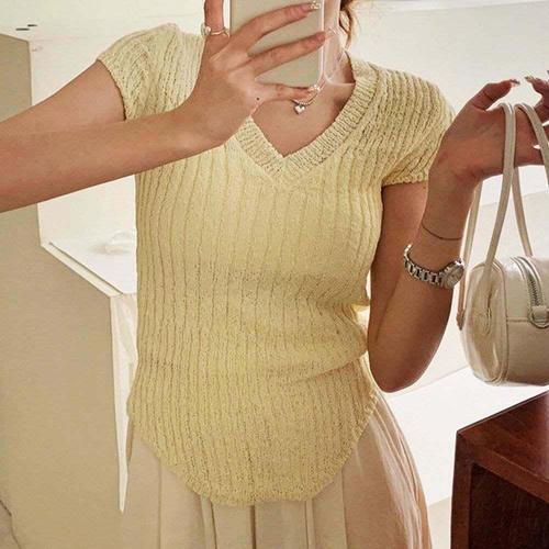 [모노무드]모노무드 여성 티 레몬 브이넥 반팔니트 여름니트 부클 반팔 캡소매