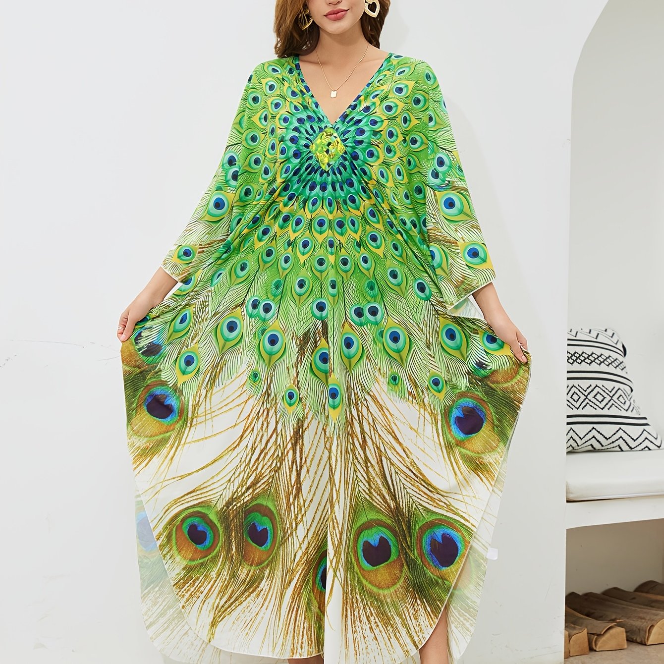 TEMU 피오콕 프린트 여성 비치 카프탄 핸드메이드 웨이브 맥시 드레스 수영복 커버업
