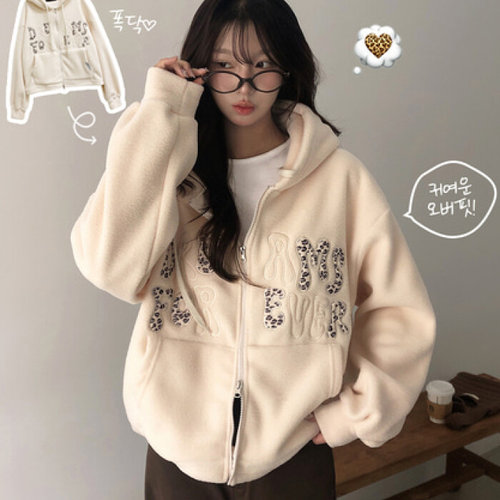 더핑크 / 알핀 오버핏 후리스 레오파드 레터링 후드 집업