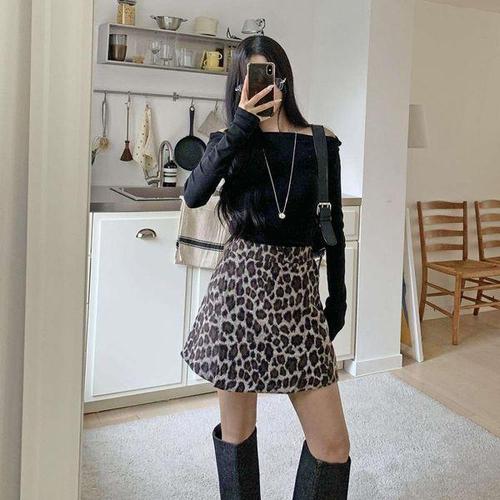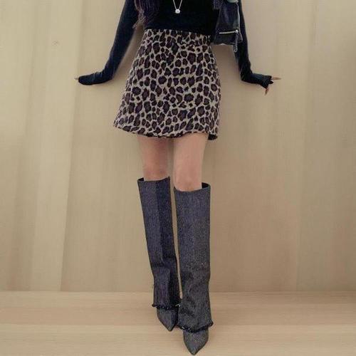 [옷자락] 여성 키치 스타일 레오파드 울 혼합 A라인 미니 치마