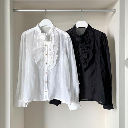 [다잇템][다잇템] 여자 비침 꽃무늬 프릴 코사쥬 콩단추 롱슬리브 블라우스_23210183_588872