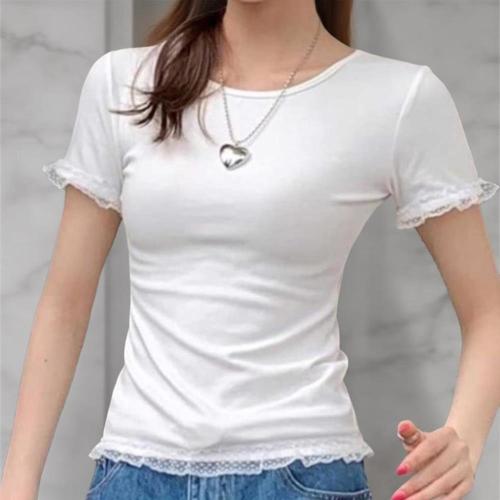 [다잇템]여성 반소매 포인트 레이스 슬림핏 티셔츠