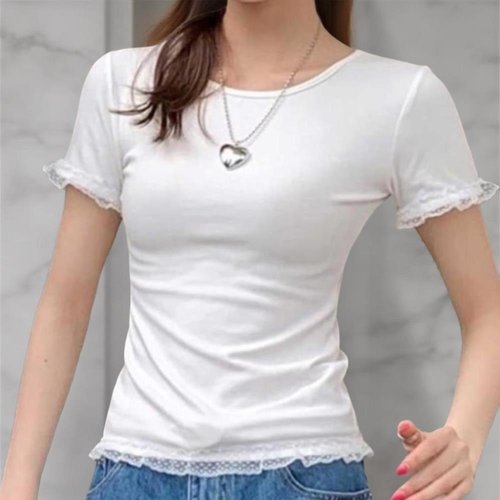 [옷자락]여성 레이스 포인트 슬림핏 반팔 티셔츠