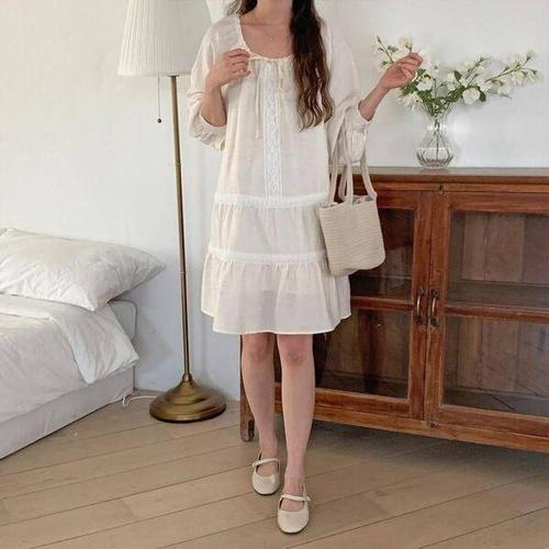 데일리앤 프루티 펀칭 자수 아일렛 프릴 레이스 롱 나시 레이어드 캉캉 끈 뷔스티에 미니 원피스 임산부