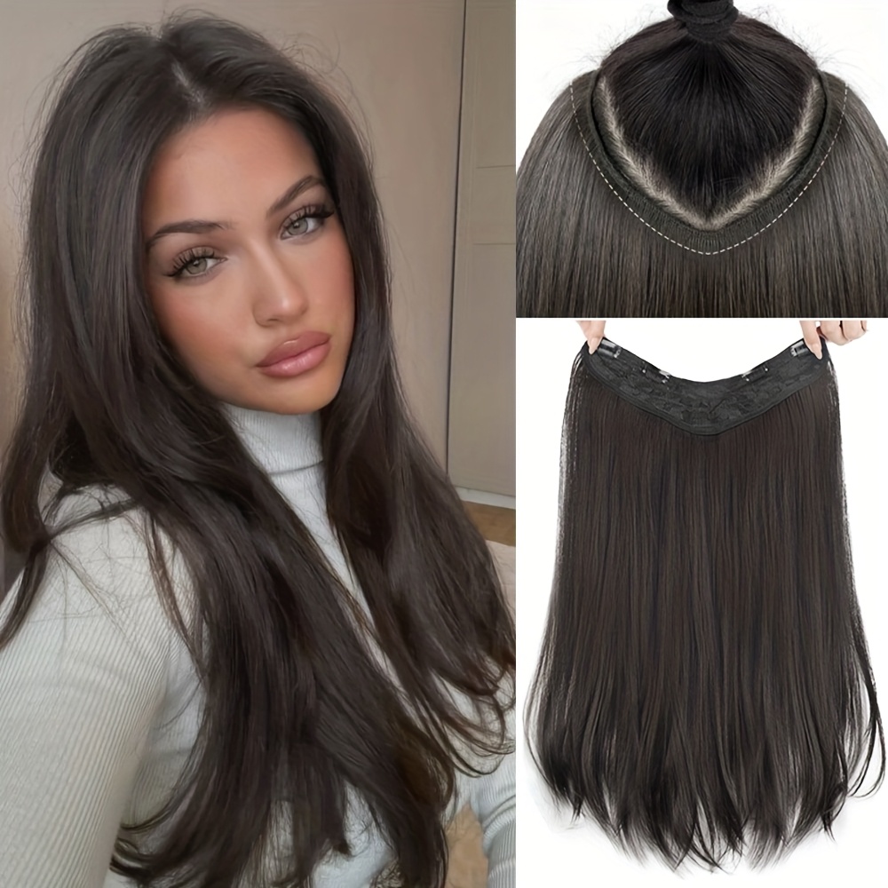TEMU 24인치 인비저블 헤어 익스텐션 여성용 롱 V형 헤어 익스텐션 3/4 풀 헤드 클립 인 헤어 익스텐션, 볼륨 추가용, 4개의 안전 클립, 합성 천연 소프트 인비저블 브라운 헤어 익스텐션, 데일리 파티용
