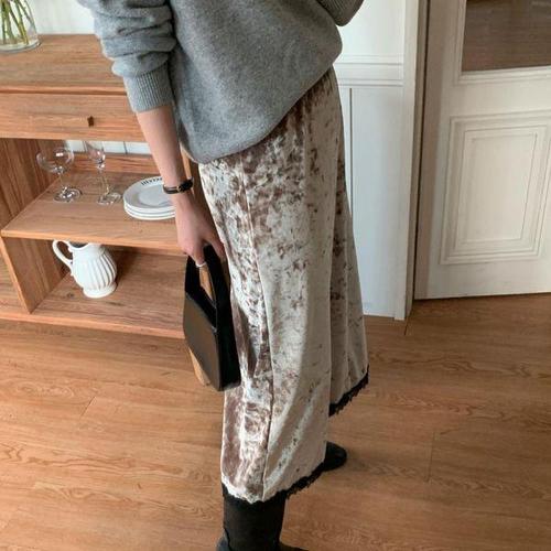 [하프클럽/]여성 벨벳 스커트 A라인 배색 레이스 밴딩 가을 롱치마