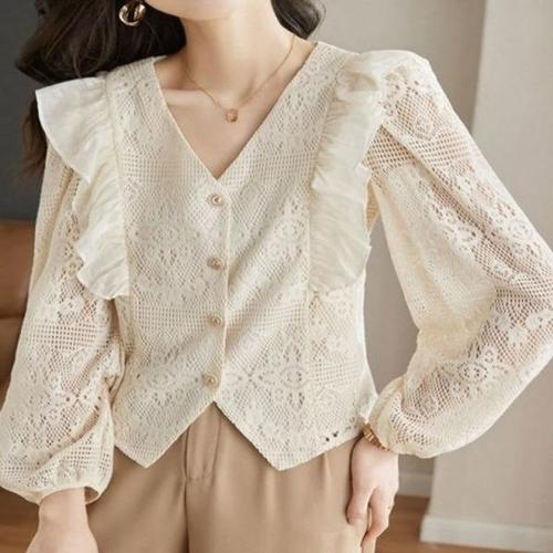 Asure 여자 봄가을 블라우스 레이스 퍼프 롱슬리브 셔츠