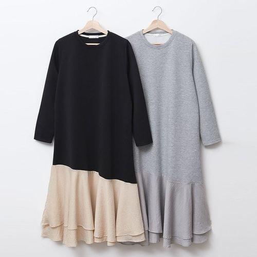 [옷자락] 여성 대형 배색 프릴 레이어드 사선 롱 드레스