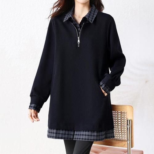 [퀸이즈] [~88까지]젯 오버핏 체크 카라 레이어드 반집업 롱 티셔츠