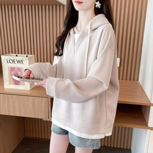 [옷자락]여자 연베이지 티 레이어드 후드 루즈핏 맨투맨
