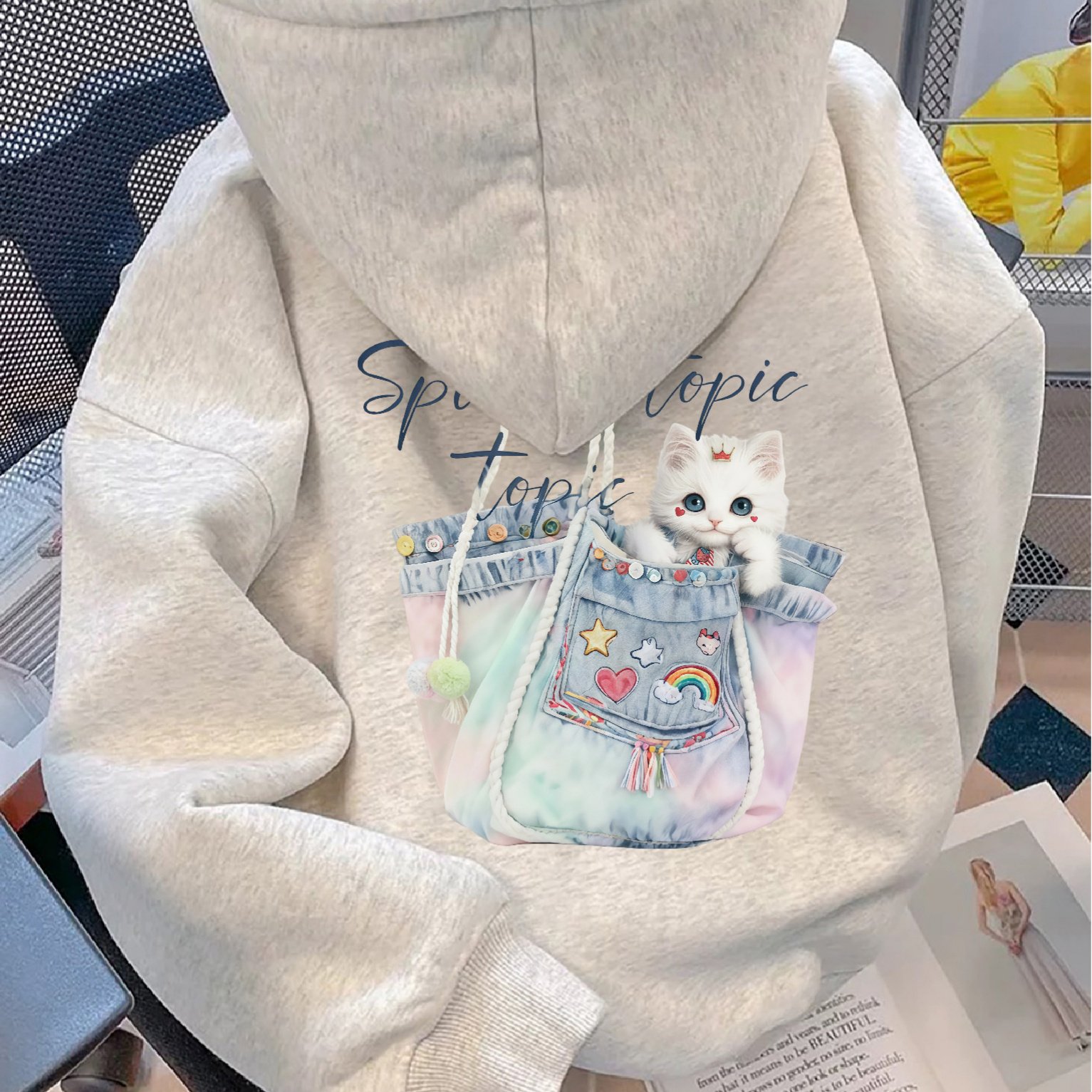 TEMU 아메리칸 빈티지 컬러풀 데님 캔버스 백 & 캣 프린트 긴팔 안감 가을 겨울 여성 후드 스웨트셔츠 루즈 캐주얼 스타일리시 다용도 레이지 스타일 후드 탑