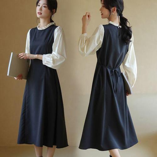 [교복몰]브이넥 레이스카라 블랙 헵번 롱원피스 경성의상 교복