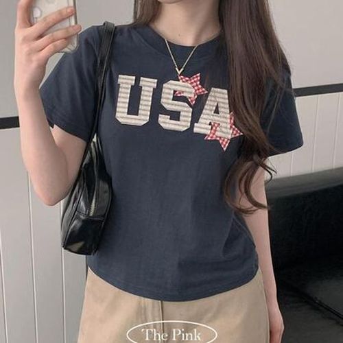 더핑크 / 라치 루즈핏 USA 패치 레터링 세미 크롭 반팔티