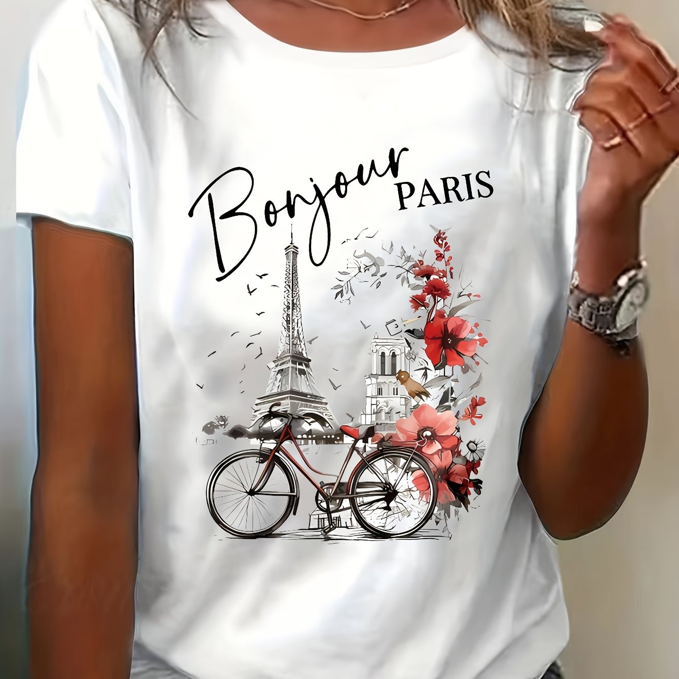 TEMU 여름 패션 파리 프린트 캐주얼 레귤러 핏 라운드 넥 반팔 티셔츠