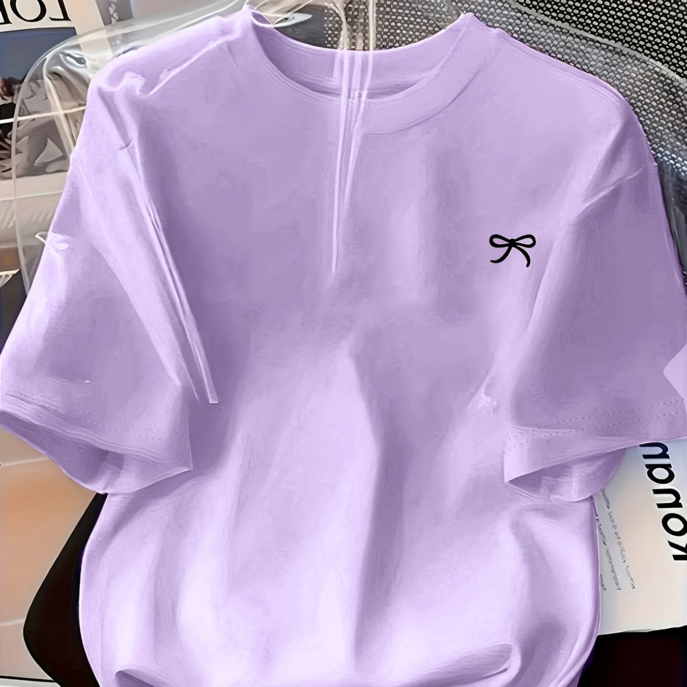 TEMU 새로운 패션 여성용 라운드넥 디자인, 쉬운 예술적인 리본 패턴 프린트, 캐주얼하고 편안한 데일리룩에 완벽한 활용도 높은 반팔 티셔츠