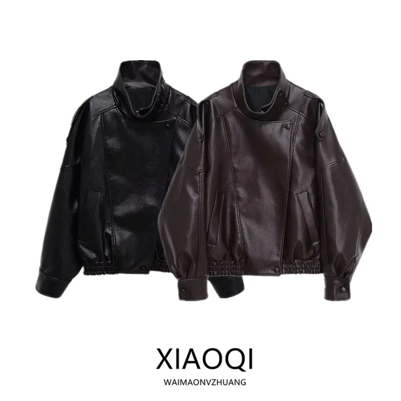 세련된 Pu 가죽 자켓 스탠드 칼라 느슨한 긴팔 코트 멋진 캐주얼 시크 다용도 겉옷 새로운 가을 여성 streetwear