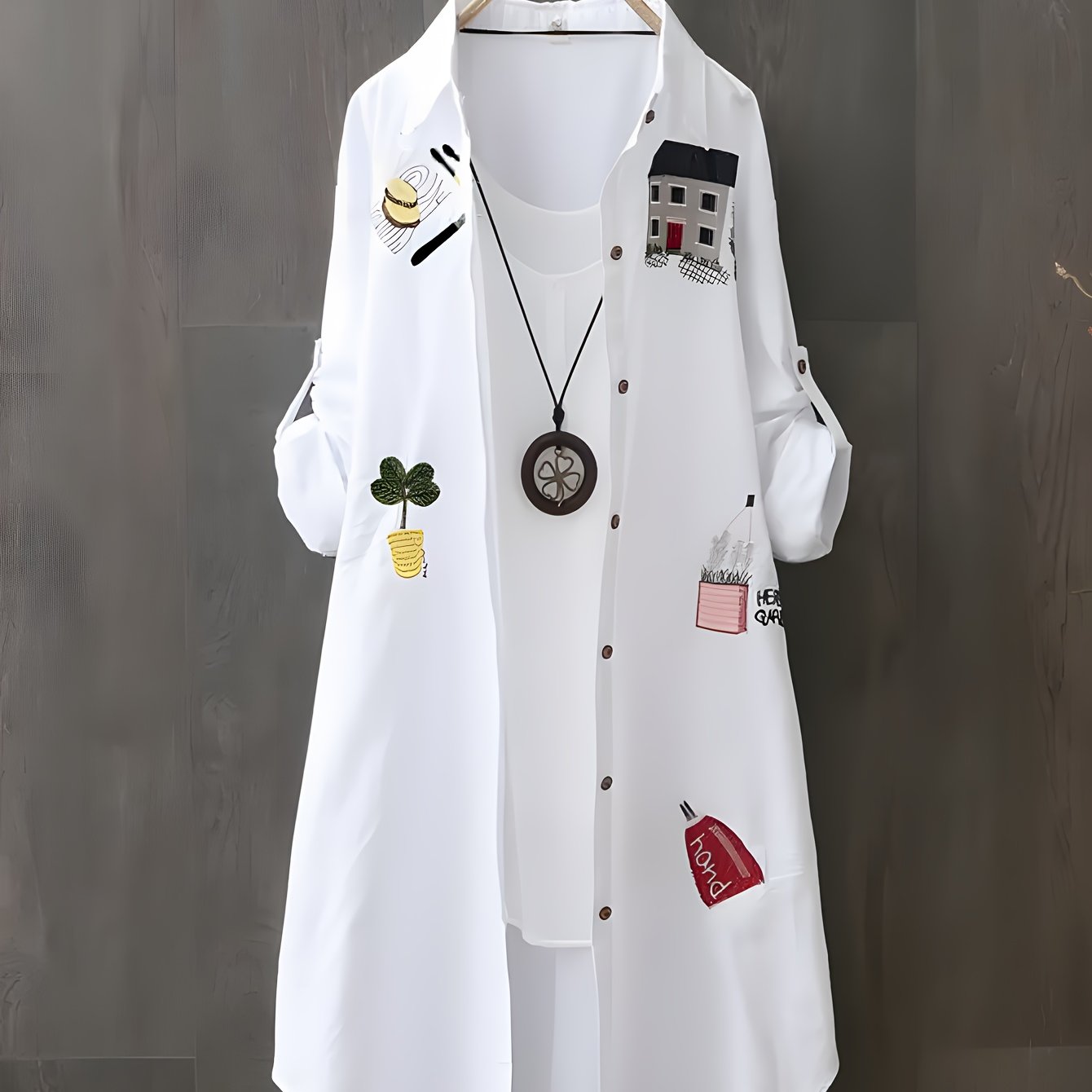 TEMU 여성용 긴팔 캐주얼 상의 - 섬세한 공예, 통기성 소재, 귀여운 만화 프린트, V넥, 루즈핏, 봄/여름/가을에 완벽, 필수 옷장 필수품