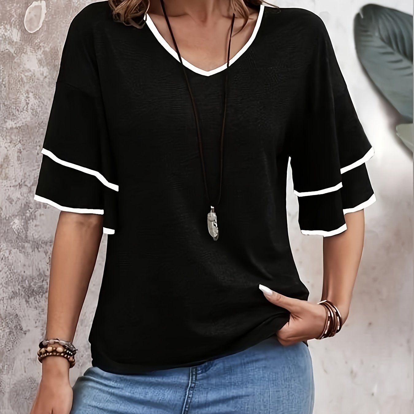 TEMU 여성용 캐주얼 V넥 반팔 티셔츠 - 여름용 단색 트림, 중간 신축성 & 세탁기 사용 가능, 귀여운 장식 트림 디테일 탑