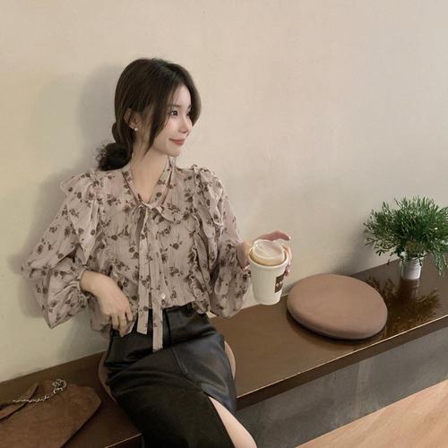[모어오브]로즈 블라우스 플라워 프릴 긴팔 탑