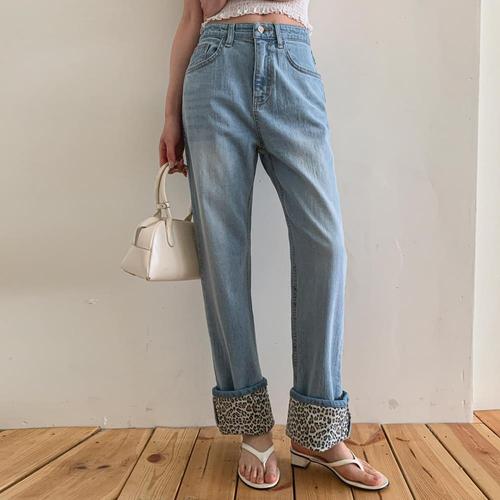 [미라클세븐]여성 중청 색상 롤업 레오파드 와이드핏 스판 청바지
