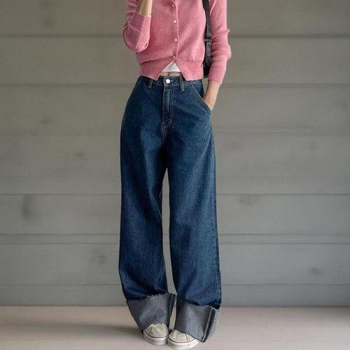 [신상오픈런]여자 컷팅 롤업 배색 루즈 와이드핏 논스판 청바지