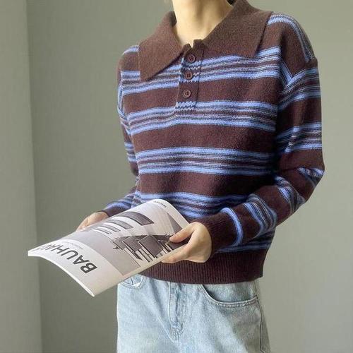 [다잇템]여성 카라 롱슬리브 콘트라스트 단가라 니트티