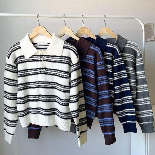 [다잇템_패션]여성 롱슬리브 줄무늬 FW 카라 니트티 베이직핏