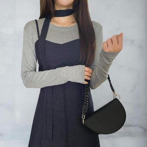 [옷자락] 여성 긴팔 티셔츠 타이넥 뷔스티에 롱 드레스 세트