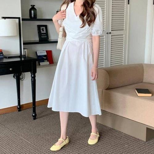 [에이치플러스몰]휴양지 쉬폰 반팔 뷔스티에 원피스 여름 롱니트