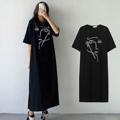 [에이치플러스몰]여성 페이스 프린팅 라운드 반팔 원피스 URK343 뷔스티에 원피스 롱원피스 여성 패턴 프..