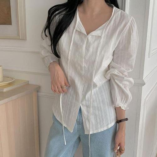 [다잇템_패션]여자 롱타이 단가라 뒷리본 벌룬 단추 블라우스