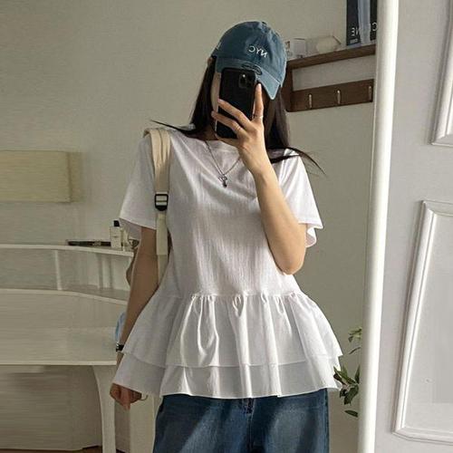 [유야]면 무지 프릴 반팔 롱 티셔츠 레이어드 -TS0764H- 여성 여름