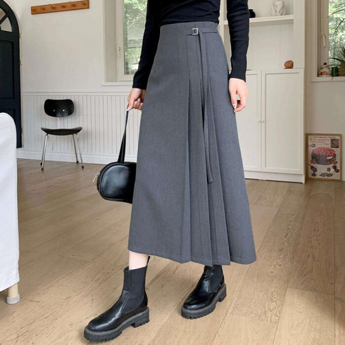 네모엔룩 롱핀턱플리츠 여성용 허리핀턱 주름A라인 벨트세트 롱 스커트. 스커트+벨트 총 2종