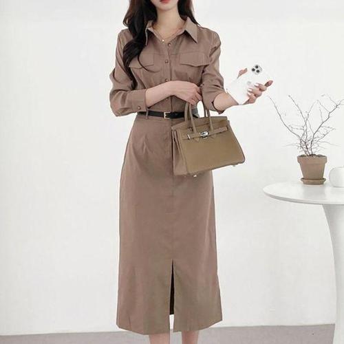 [에이치플러스몰]클래식 여성 셔츠원피스 허리벨트 하객룩 롱 원피스
